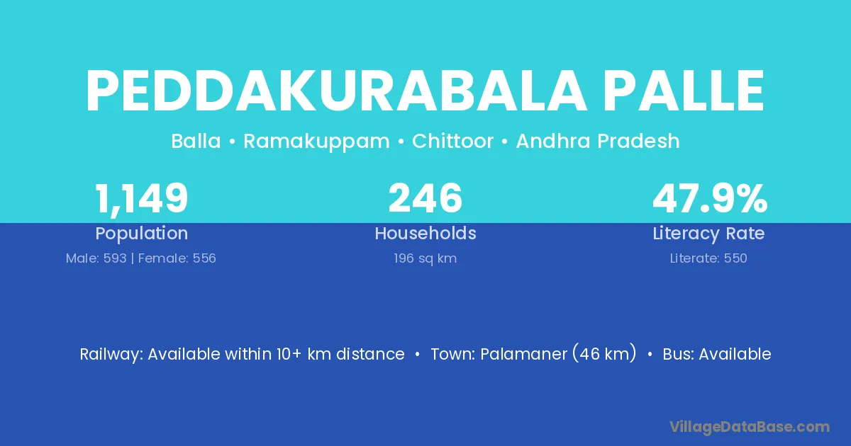 Palamaner (46 km) is the nearest town to Peddakurabala Palle village for major economic activities and is located approximately 46 km away.