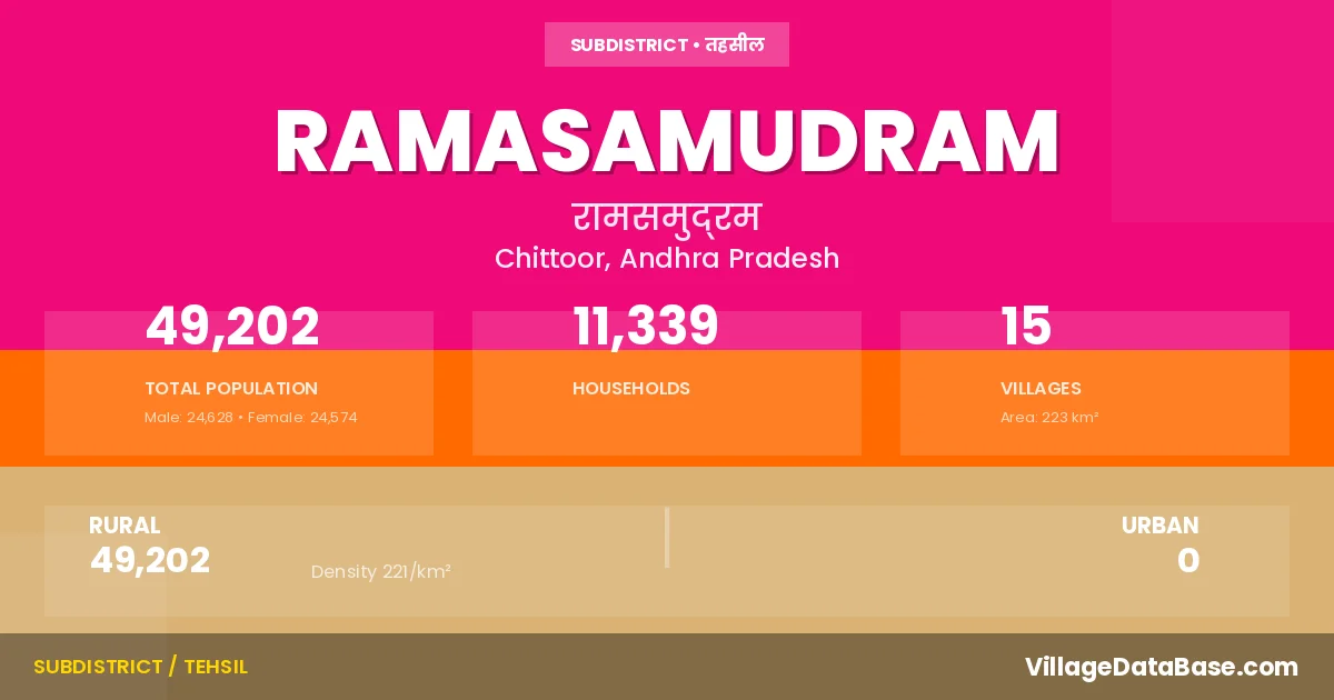 Ramasamudram is a town and Mandal in the Chittoor district of the Andhra Pradesh. In India, a Mandal is a subdivision of a district responsible for the administration and revenue collection of a specific area within the district. Mandals play a crucial role in the local governance structure, contributing significantly to the development and administration of their communities.