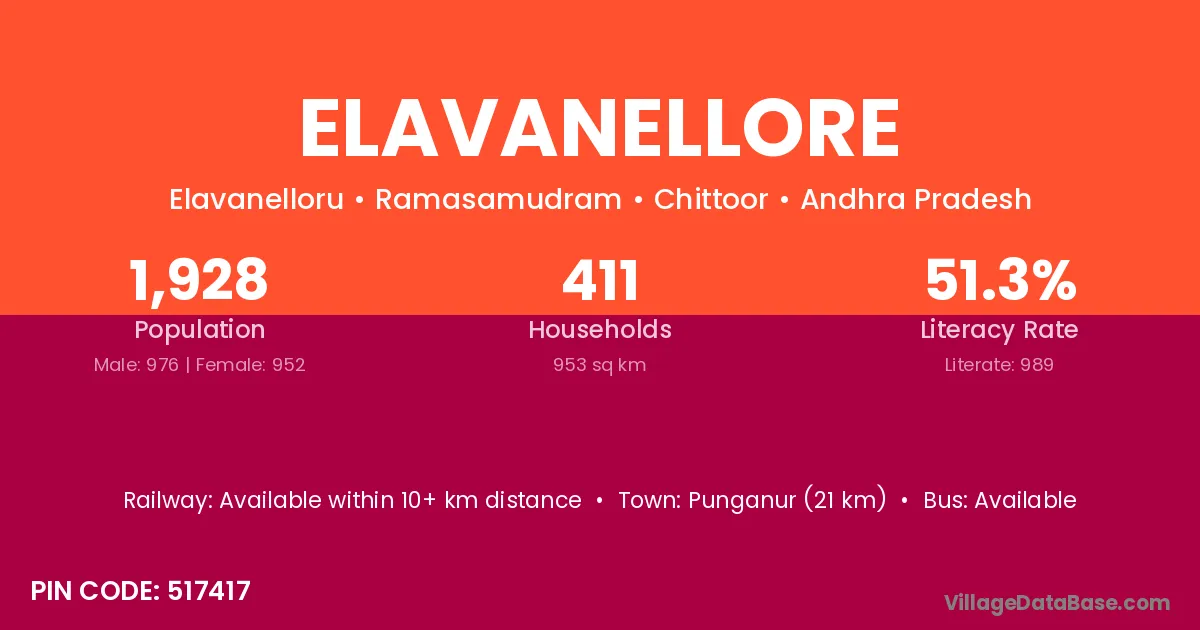 Elavanellore village has a total population of 1,928 people, of which 976 are males and 952 are females.