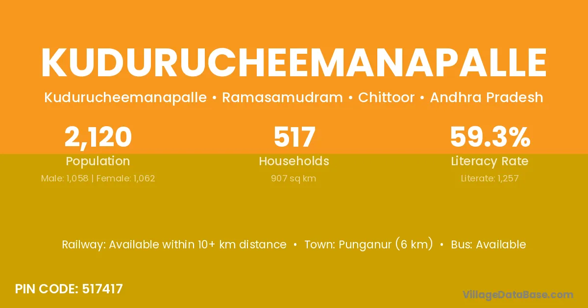 Kudurucheemanapalle village has a total population of 2,120 people, of which 1,058 are males and 1,062 are females.