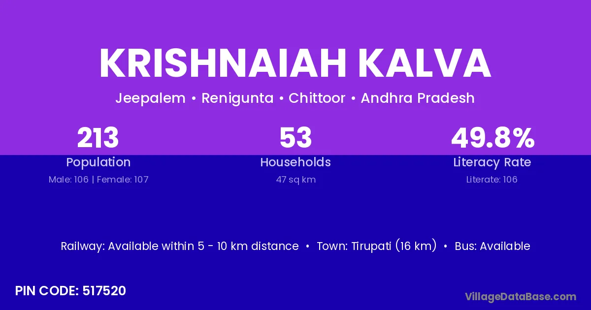 Krishnaiah Kalva village has a total population of 213 people, of which 106 are males and 107 are females.