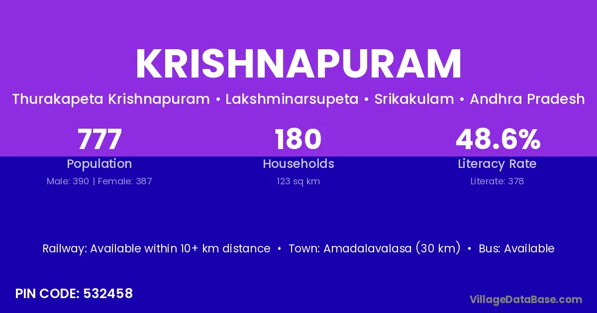 The literacy rate of Krishnapuram village is 56.17%. Male literacy stands at 63.89% and female literacy at 48.83%.