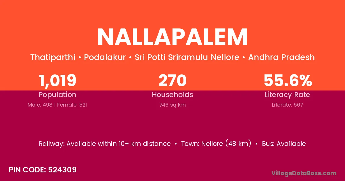 Tirupati (16 km) is the nearest town to Nallapalem village for major economic activities and is located approximately 16 km away.