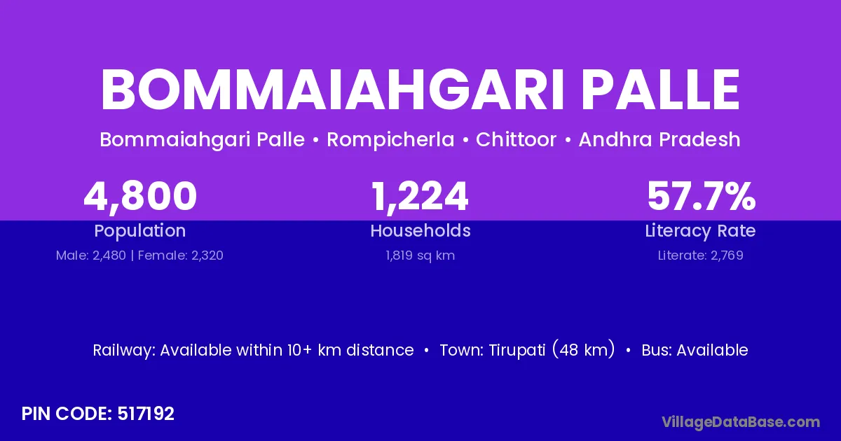 Tirupati (48 km) is the nearest town to Bommaiahgari Palle village for major economic activities and is located approximately 48 km away.