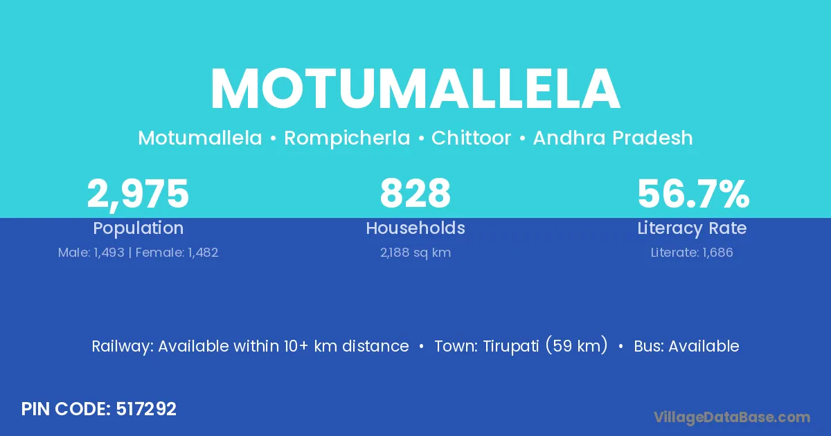 Tirupati (59 km) is the nearest town to Motumallela village for major economic activities and is located approximately 59 km away.
