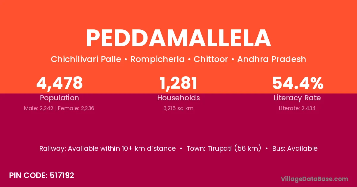 Tirupati (56 km) is the nearest town to Peddamallela village for major economic activities and is located approximately 56 km away.