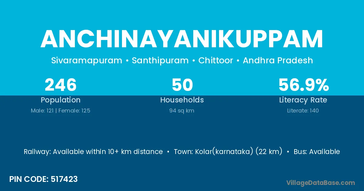 Kolar(karnataka) (22 km) is the nearest town to Anchinayanikuppam village for major economic activities and is located approximately 22 km away.
