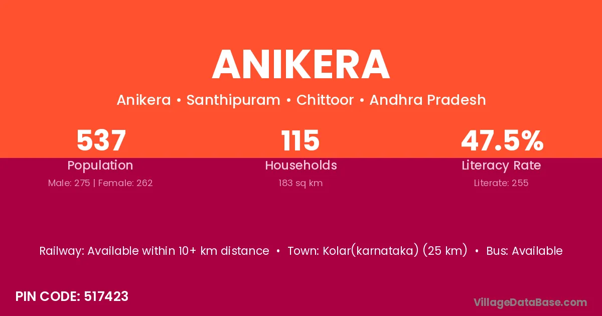 Kolar(karnataka) (25 km) is the nearest town to Anikera village for major economic activities and is located approximately 25 km away.