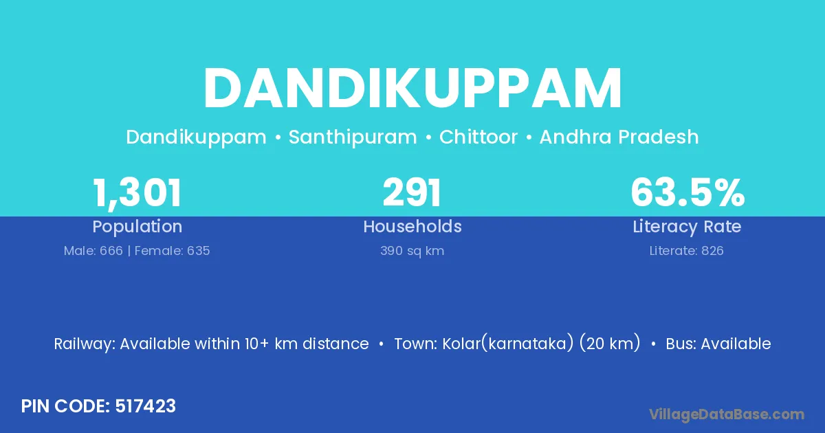 Dandikuppam village has a total population of 1,301 people, of which 666 are males and 635 are females.