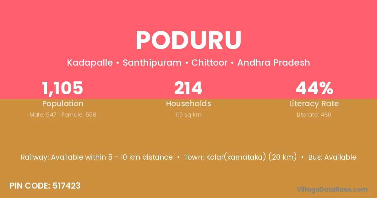 Kolar(karnataka) (20 km) is the nearest town to Poduru village for major economic activities and is located approximately 20 km away.
