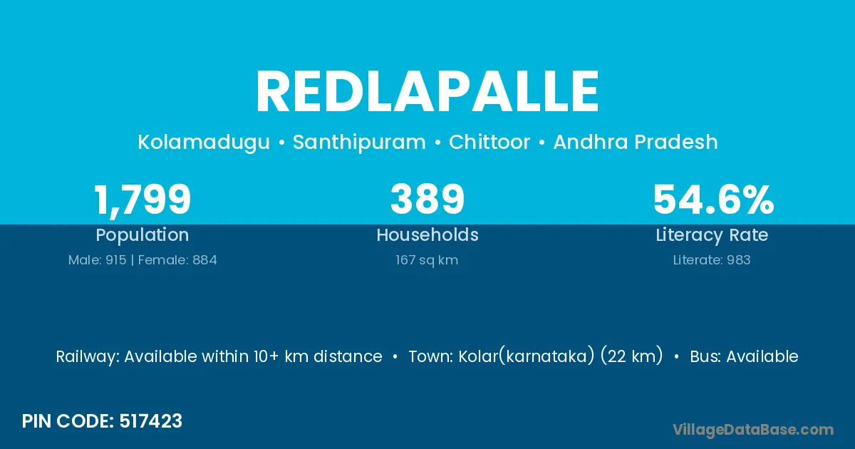 Kolar(karnataka) (22 km) is the nearest town to Redlapalle village for major economic activities and is located approximately 22 km away.