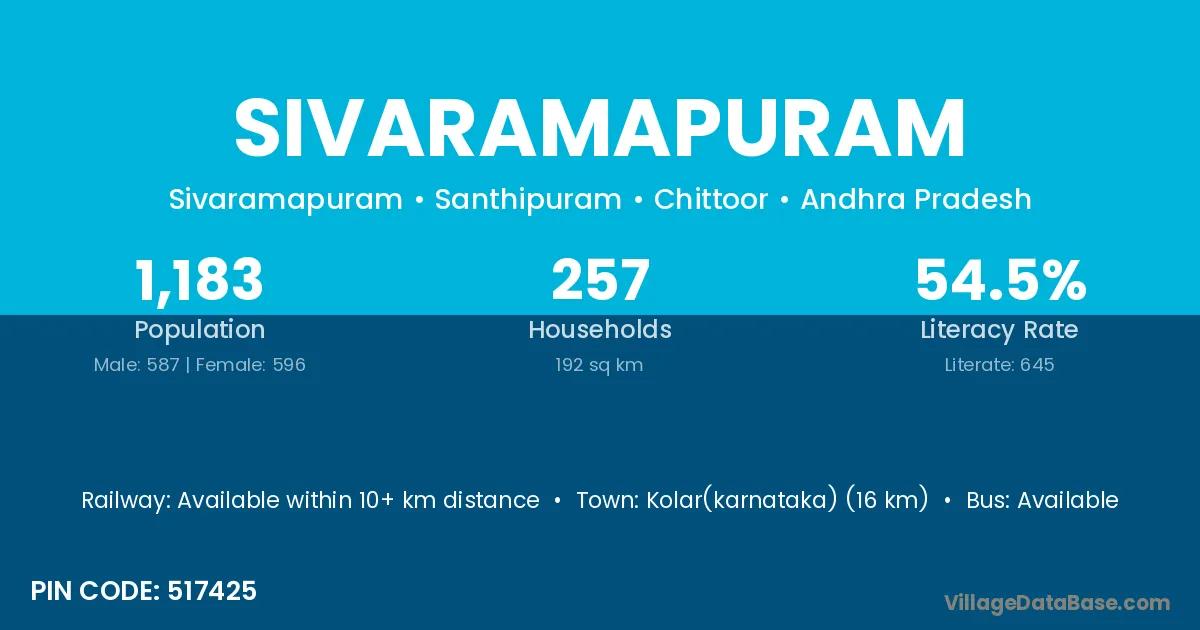 Kolar(karnataka) (16 km) is the nearest town to Sivaramapuram village for major economic activities and is located approximately 16 km away.