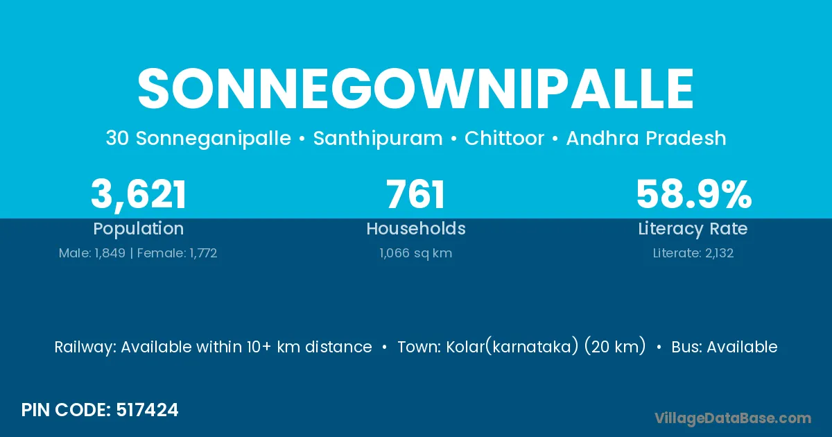 Kolar(karnataka) (20 km) is the nearest town to Sonnegownipalle village for major economic activities and is located approximately 20 km away.