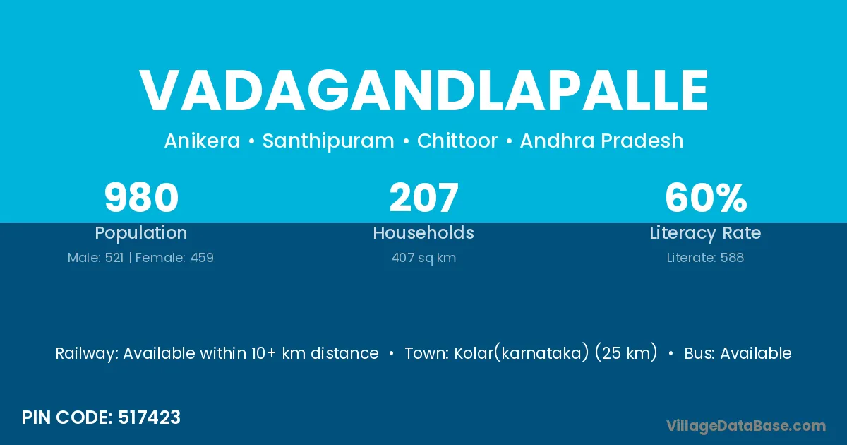 Vadagandlapalle village has a total population of 980 people, of which 521 are males and 459 are females.