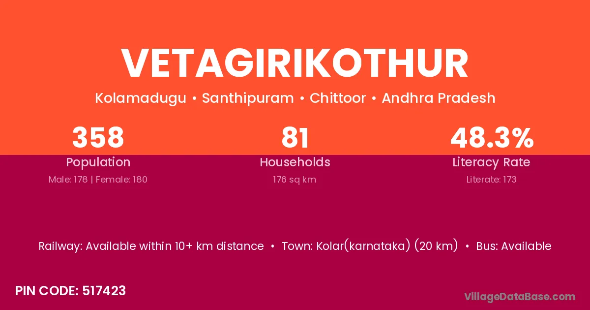 Vetagirikothur village has a total population of 358 people, of which 178 are males and 180 are females.