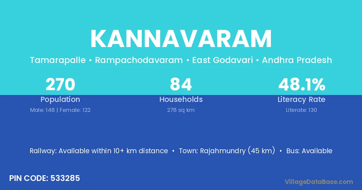 The literacy rate of Kannavaram village is 51.59%. Male literacy stands at 61.89% and female literacy at 42.16%.