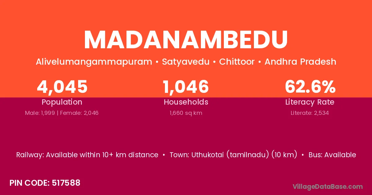 Uthukotai (tamilnadu) (10 km) is the nearest town to Madanambedu village for major economic activities and is located approximately 10 km away.