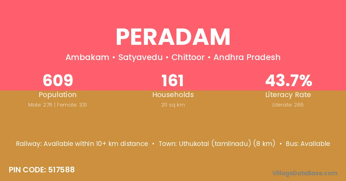 Uthukotai (tamilnadu) (8 km) is the nearest town to Peradam village for major economic activities and is located approximately 8 km away.