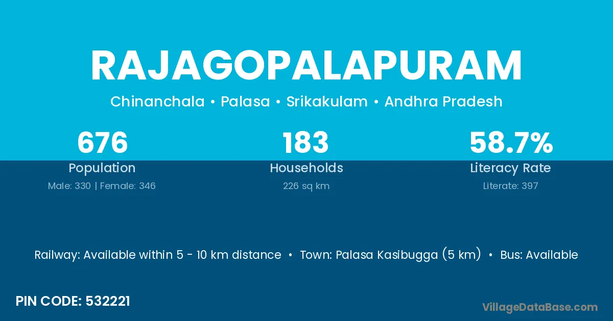 The literacy rate of Rajagopalapuram village is 57.14%. Male literacy stands at 62.65% and female literacy at 51.82%.