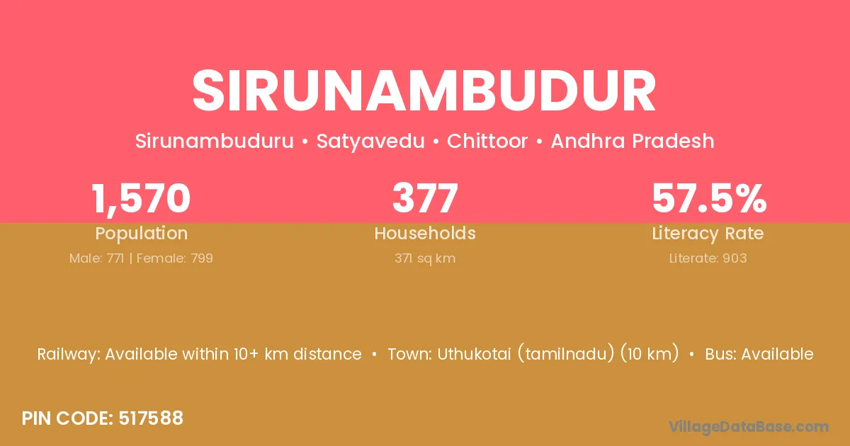 Sirunambudur village has a total population of 1,570 people, of which 771 are males and 799 are females.