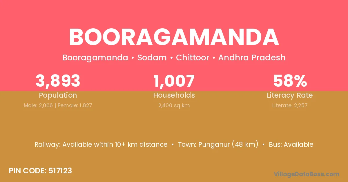 Punganur (48 km) is the nearest town to Booragamanda village for major economic activities and is located approximately 48 km away.