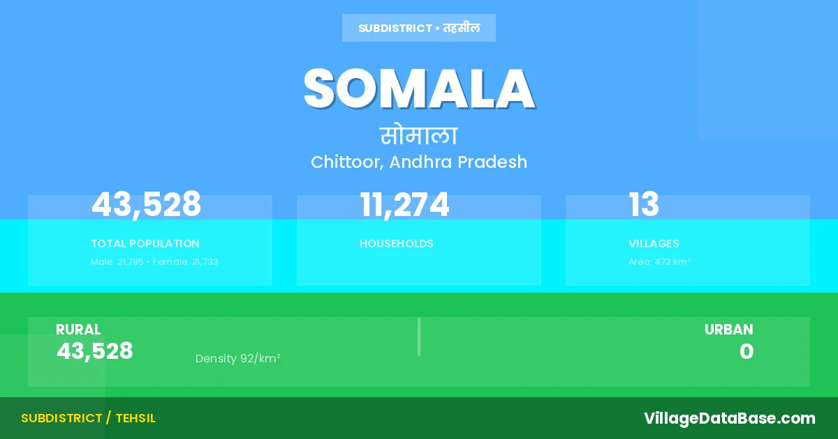 According to the 2011 census The total area of Somala Mandal is 472 km², with a population of 43528 people. The population density is 92 inhabitants per square kilometre, and there are approximately 11274 houses in the sub district.