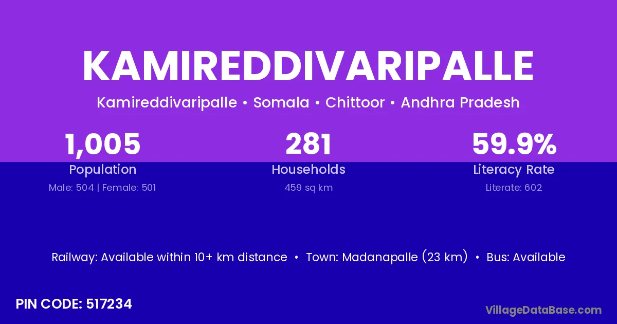 Kamireddivaripalle village has a total population of 1,005 people, of which 504 are males and 501 are females.