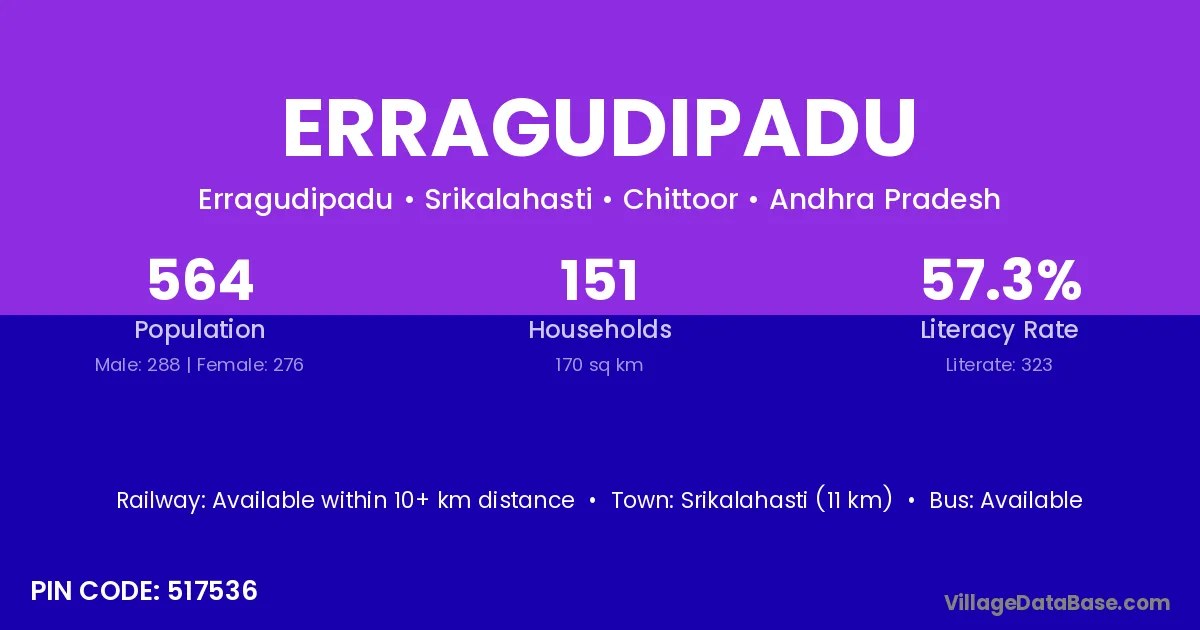 Srikalahasti (11 km) is the nearest town to Erragudipadu village for major economic activities and is located approximately 11 km away.