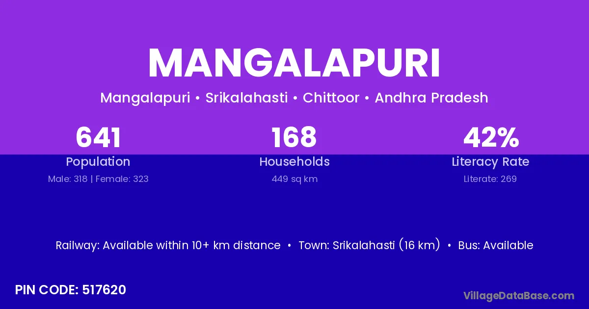 Srikalahasti (16 km) is the nearest town to Mangalapuri village for major economic activities and is located approximately 16 km away.