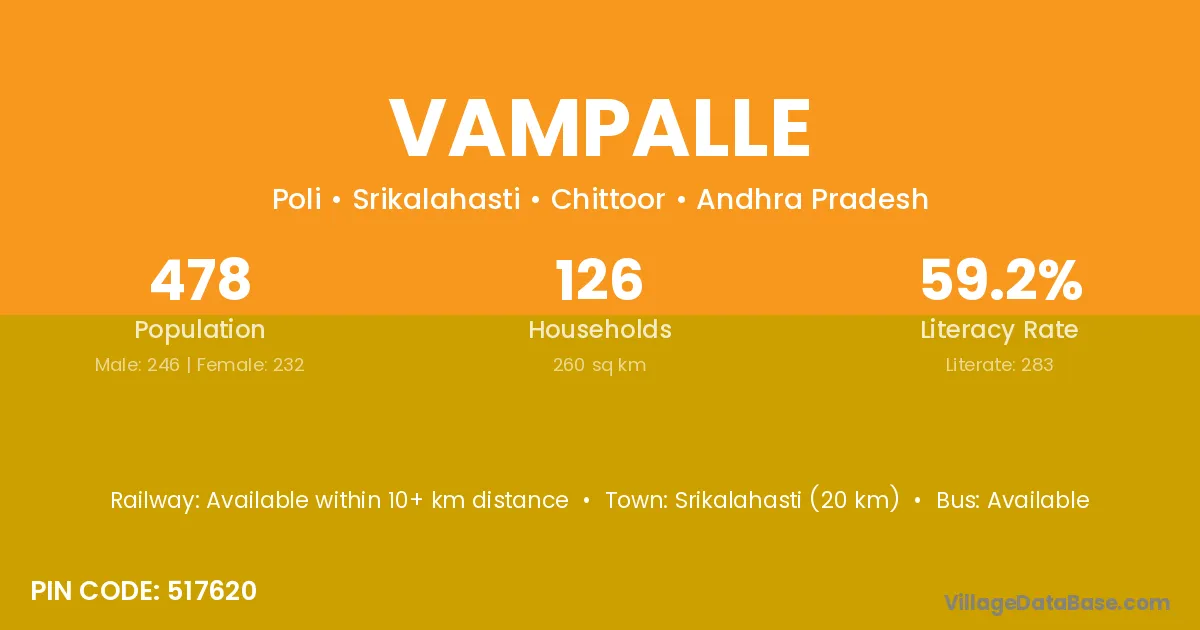 Srikalahasti (20 km) is the nearest town to Vampalle village for major economic activities and is located approximately 20 km away.