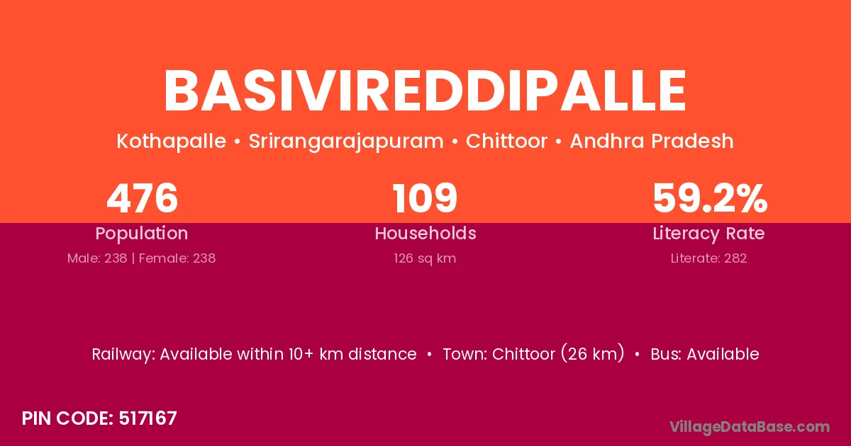 Basivireddipalle village has a total population of 476 people, of which 238 are males and 238 are females.