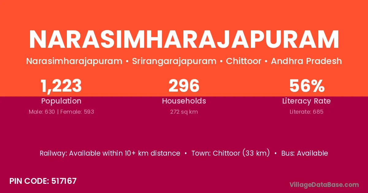 Chittoor (33 km) is the nearest town to Narasimharajapuram village for major economic activities and is located approximately 33 km away.
