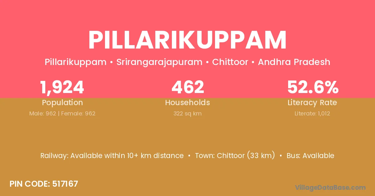 Pillarikuppam village has a total population of 1,924 people, of which 962 are males and 962 are females.