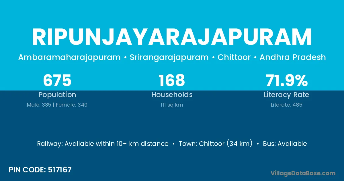 Chittoor (34 km) is the nearest town to Ripunjayarajapuram village for major economic activities and is located approximately 34 km away.