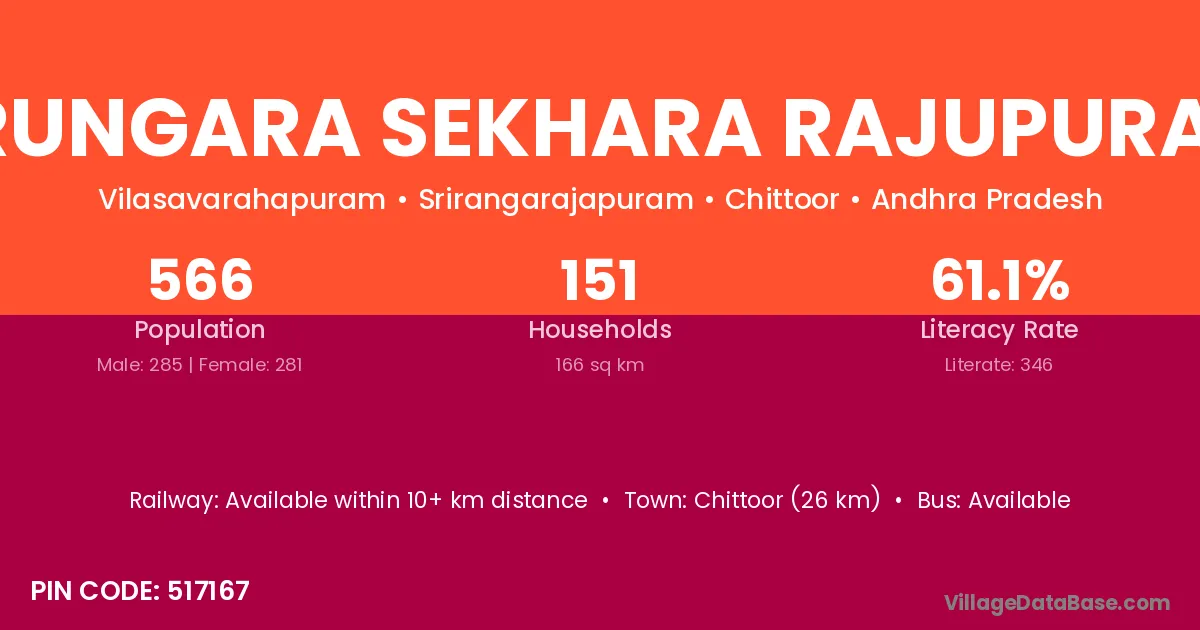 Chittoor (26 km) is the nearest town to Srungara Sekhara Rajupuram village for major economic activities and is located approximately 26 km away.