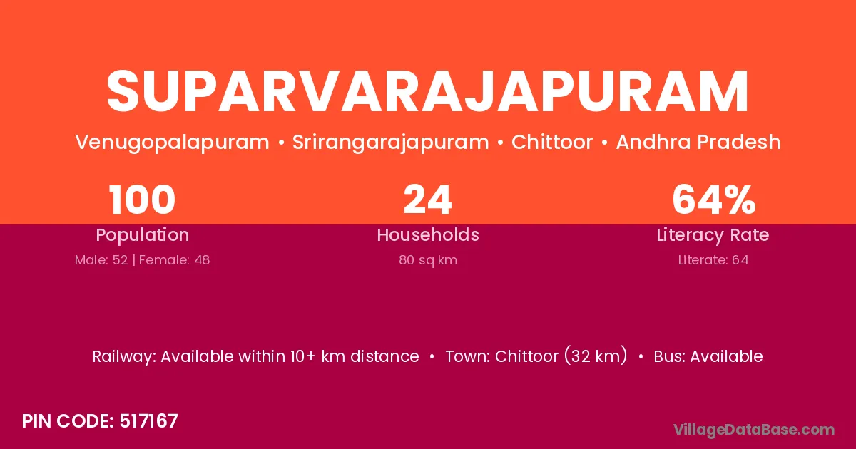 Chittoor (32 km) is the nearest town to Suparvarajapuram village for major economic activities and is located approximately 32 km away.