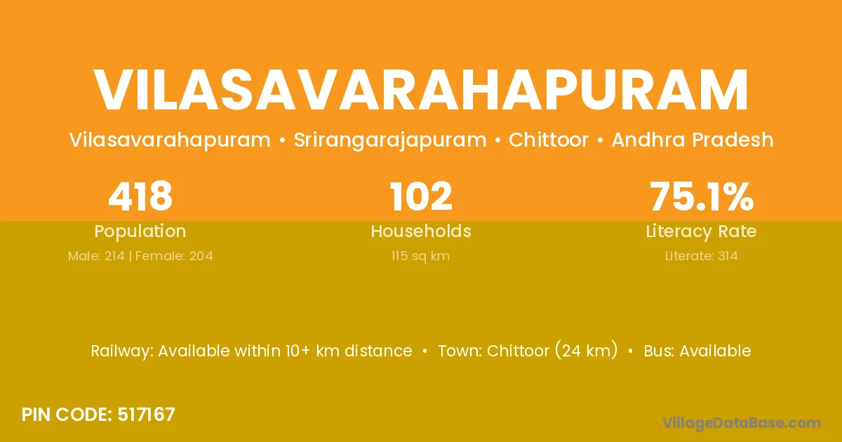 Chittoor (24 km) is the nearest town to Vilasavarahapuram village for major economic activities and is located approximately 24 km away.