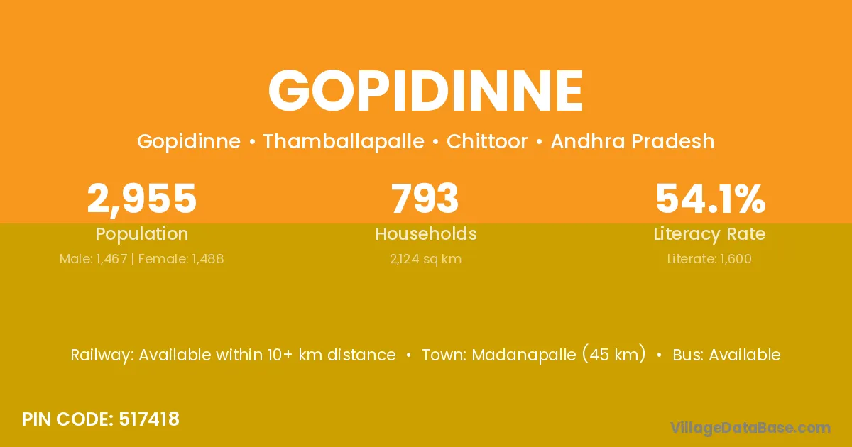 Madanapalle (45 km) is the nearest town to Gopidinne village for major economic activities and is located approximately 45 km away.