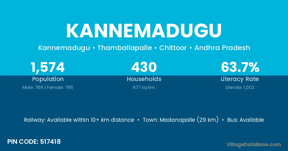 Madanapalle (29 km) is the nearest town to Kannemadugu village for major economic activities and is located approximately 29 km away.