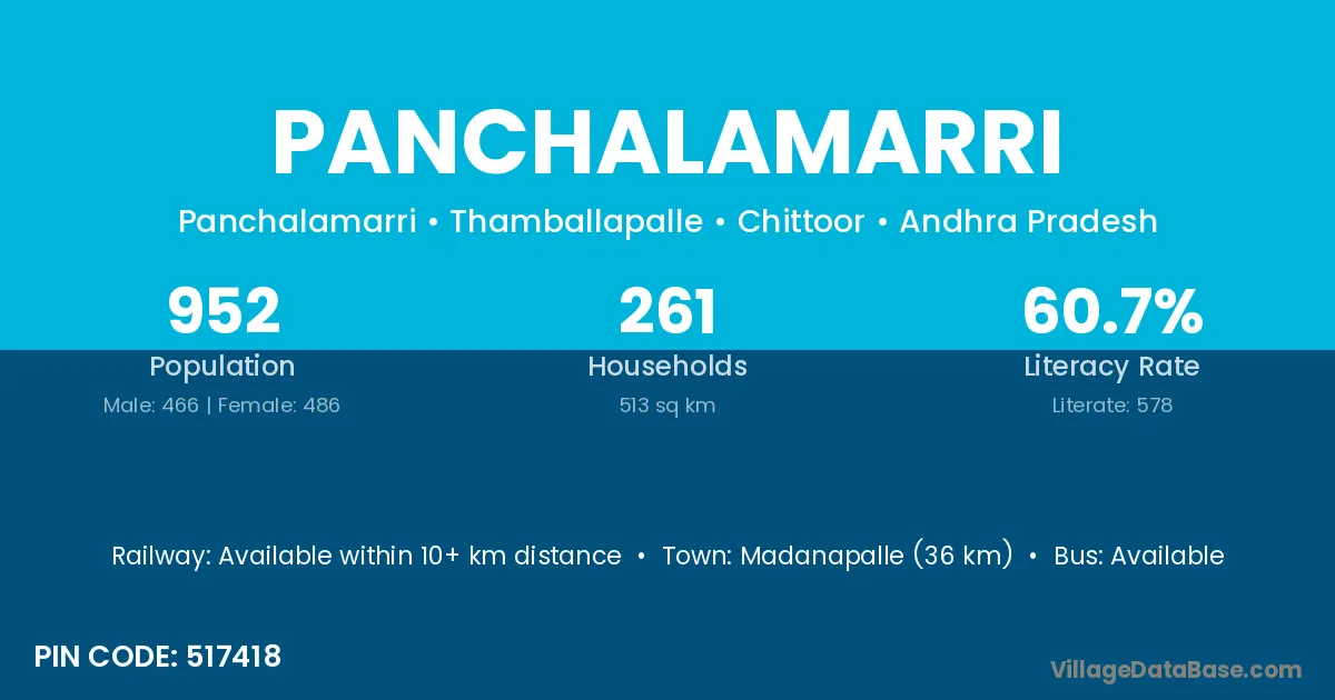 Madanapalle (36 km) is the nearest town to Panchalamarri village for major economic activities and is located approximately 36 km away.