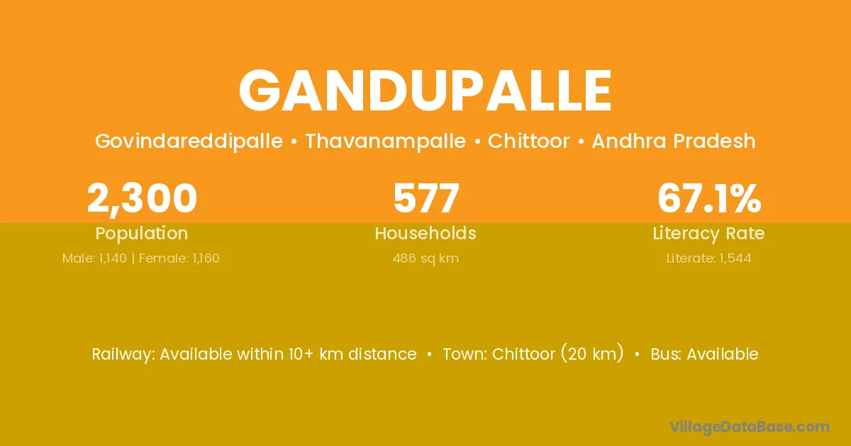 Chittoor (20 km) is the nearest town to Gandupalle village for major economic activities and is located approximately 20 km away.
