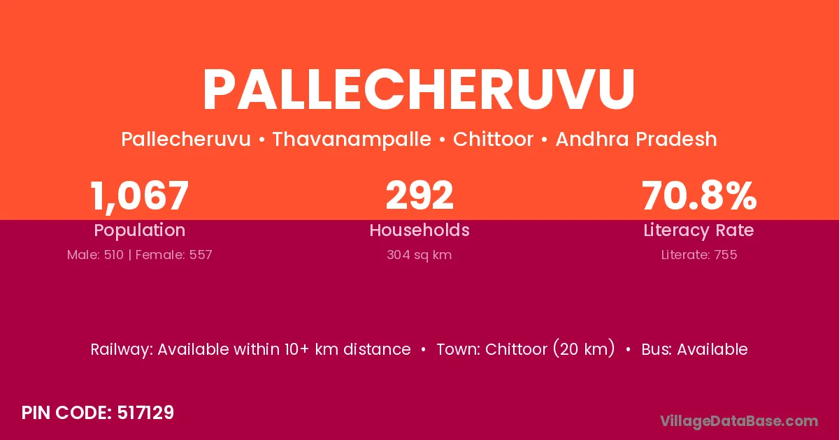 Pallecheruvu village has a total population of 1,067 people, of which 510 are males and 557 are females.