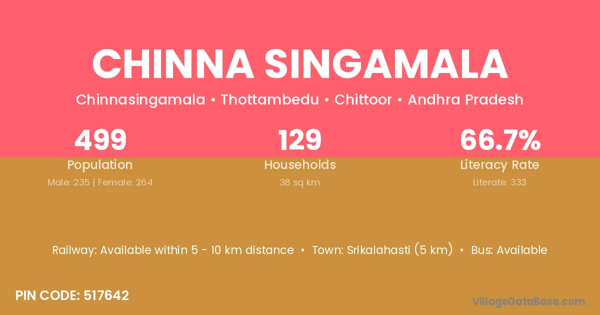 Chinna Singamala village has a total population of 499 people, of which 235 are males and 264 are females.