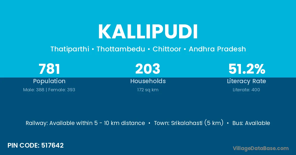 Srikalahasti (5 km) is the nearest town to Kallipudi village for major economic activities and is located approximately 5 km away.