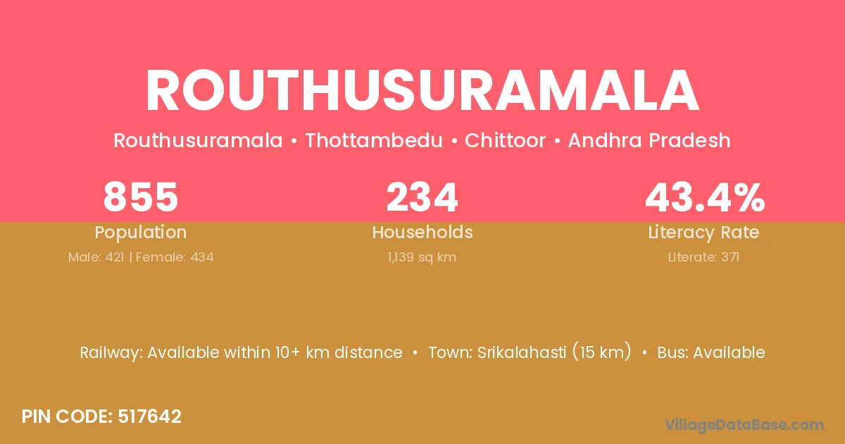 Routhusuramala village has a total population of 855 people, of which 421 are males and 434 are females.