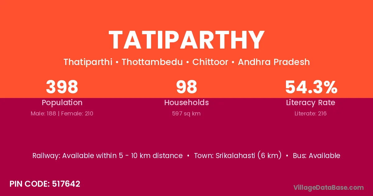 Tatiparthy village has a total population of 398 people, of which 188 are males and 210 are females.