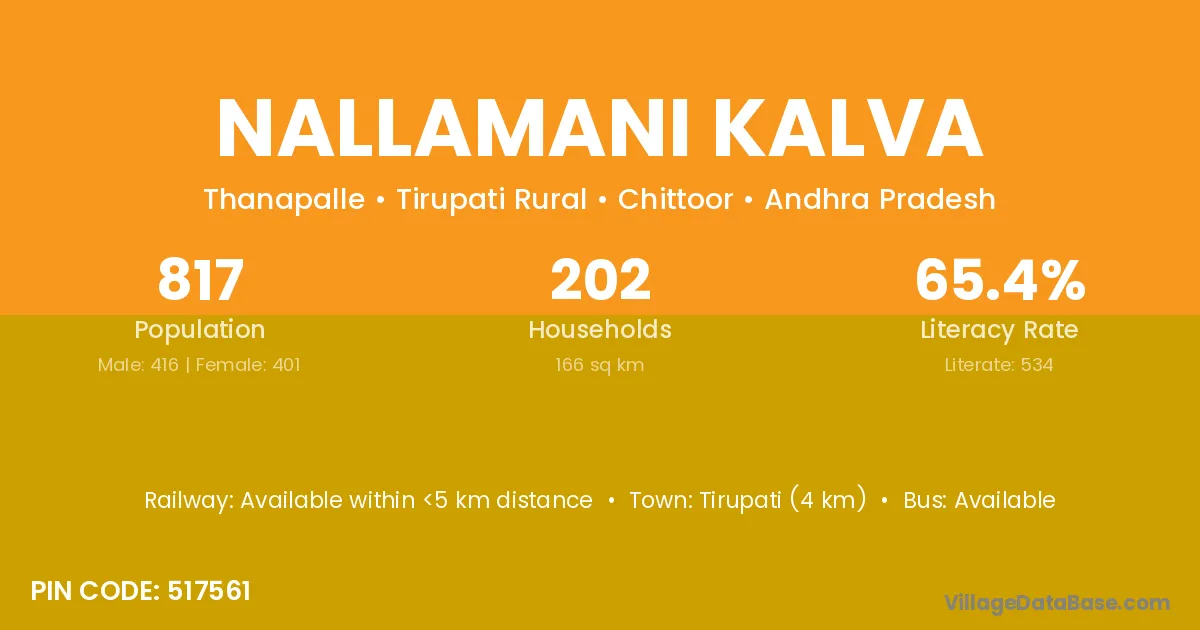 Tirupati (4 km) is the nearest town to Nallamani Kalva village for major economic activities and is located approximately 4 km away.
