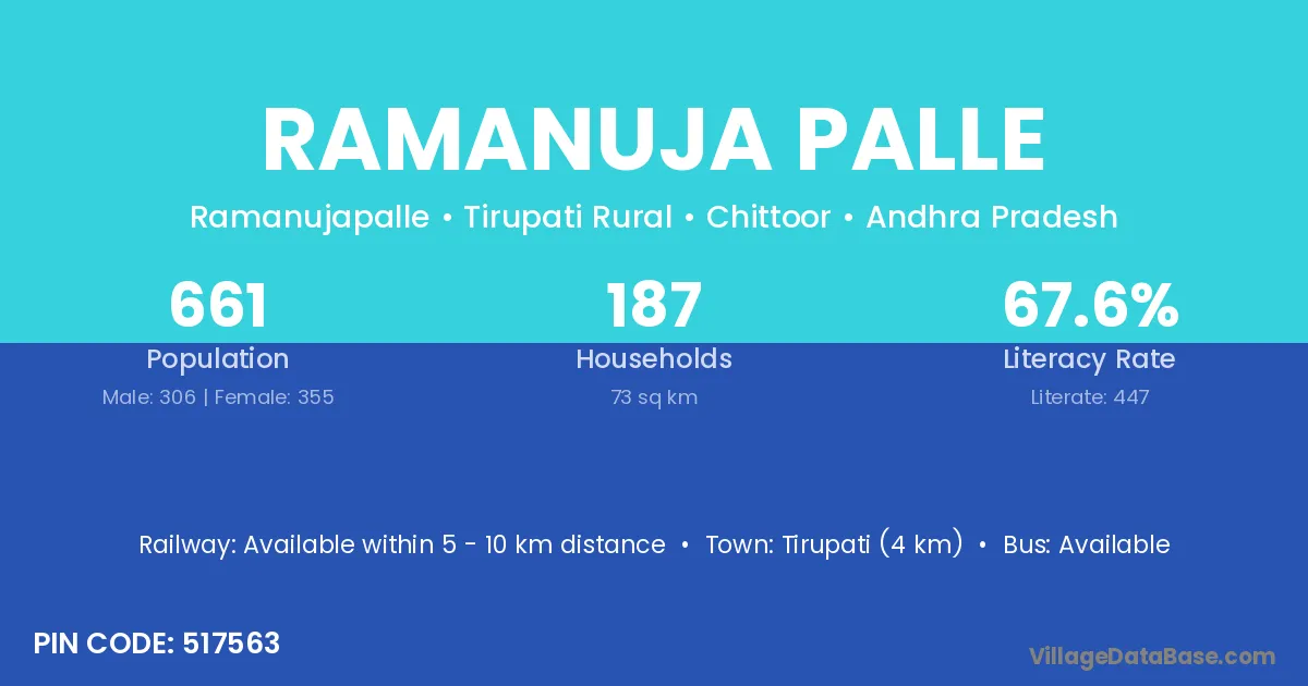 Ramanuja Palle village has a total population of 661 people, of which 306 are males and 355 are females.