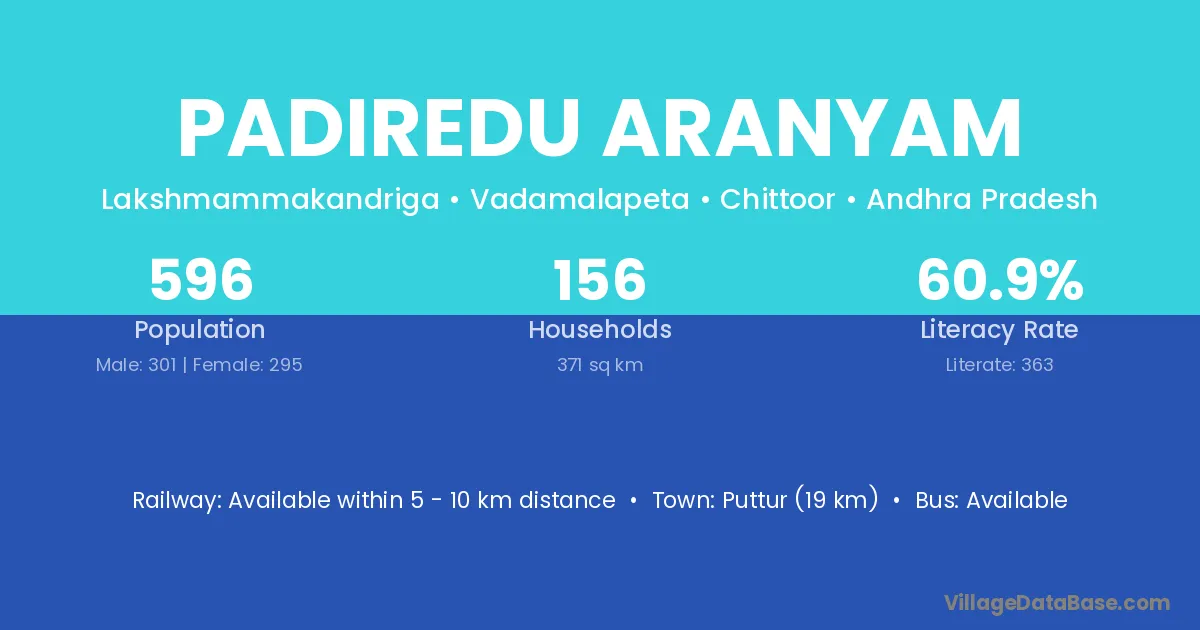 Padiredu Aranyam village has a total population of 596 people, of which 301 are males and 295 are females.