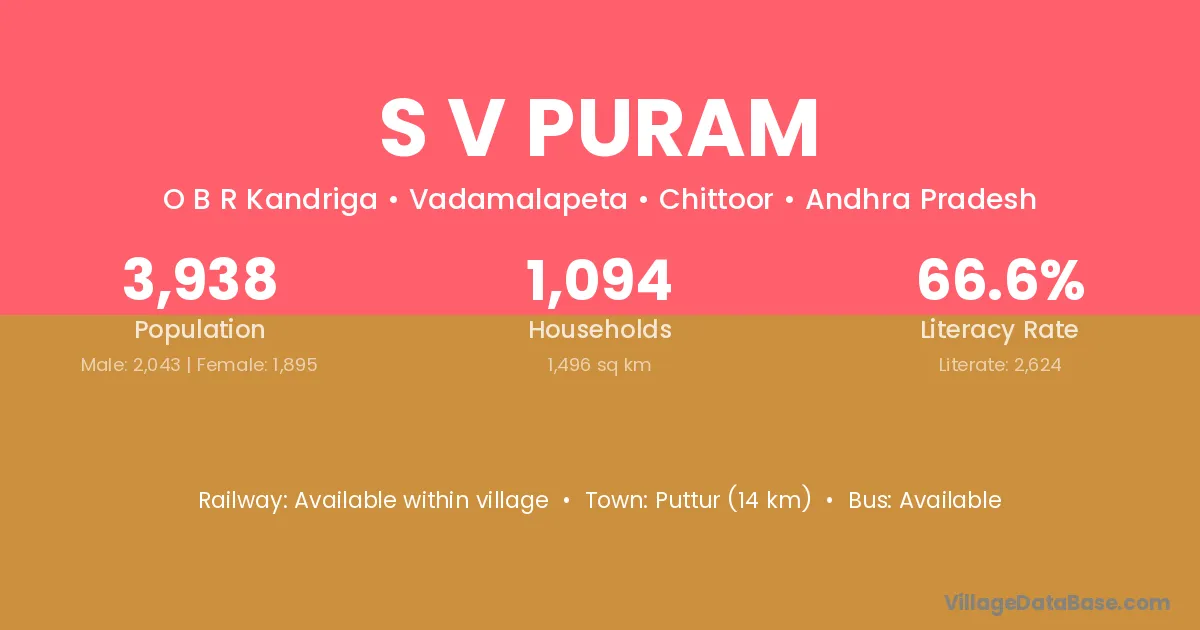 S V Puram village has a total population of 3,938 people, of which 2,043 are males and 1,895 are females.